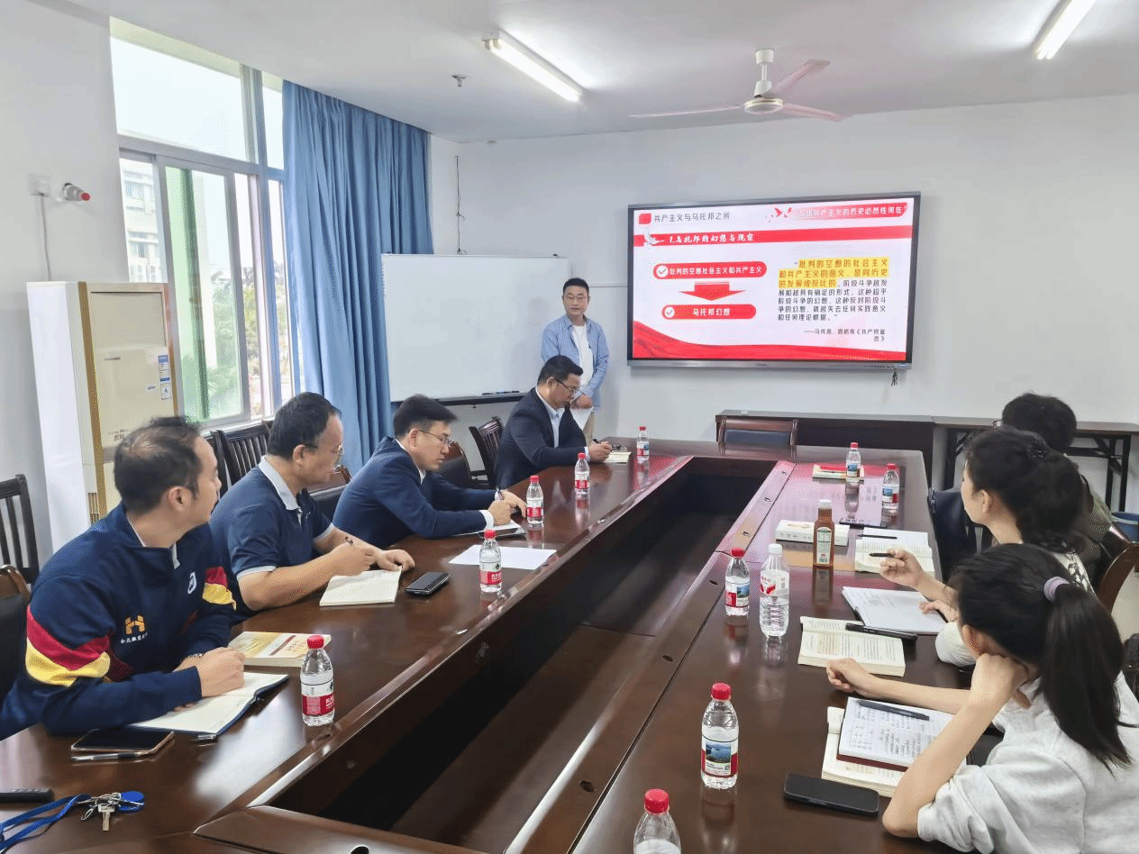 2025年12月20日上午,今年会官方网站马克思主义基本原理教研室集体备课会在社科楼A308会议室召开,围绕“党的二十届四中全会精神有效融入马克思主义基本原理第七章共产主义崇高理想及其最终实现的教学设计”主题展开学习研讨。校党委常委、副校长陈骏参加。会议由教研室主任范明水主持。