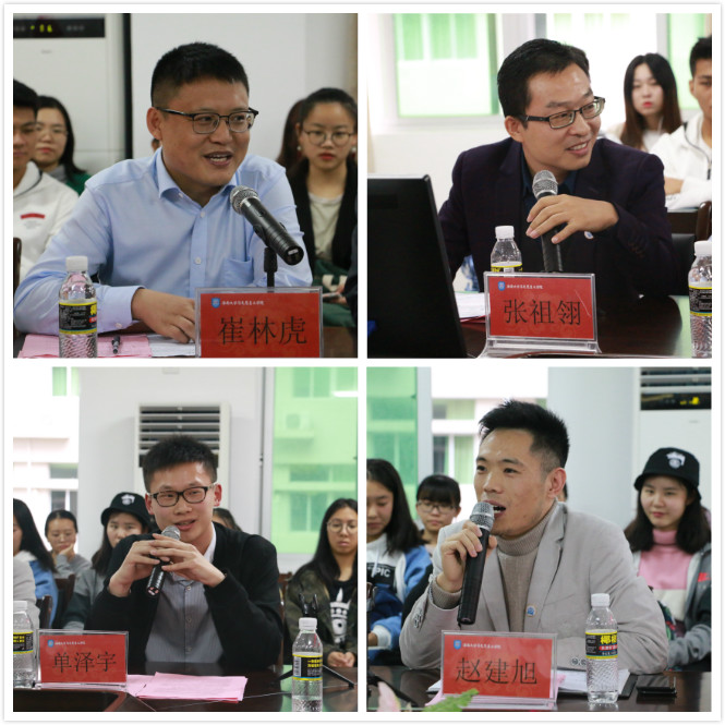 校友崔林虎、张祖翎、赵建旭、单泽宇在论坛上分别做了经验分享,纷纷表达了对马院及母校的思念,并对能够参加这次论坛感到荣幸。他们从自我经验出发,分别从日常学习困惑、学生干部定位、考研准备、就业方向、创业发展等多方面进行指导,言简意赅的表达与亲切的沟通方式唤起了很多同学的共鸣,并积极与现场师生进行交流互动,共同讨论生活与学习方面的困扰,现场气氛轻松活跃。