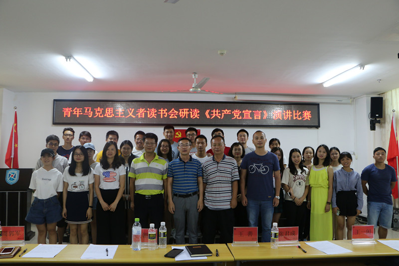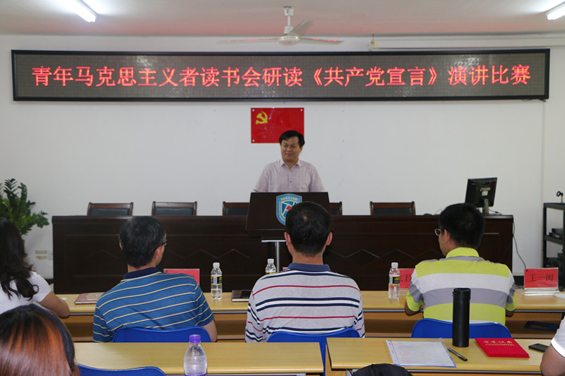 为纪念《共产党宣言》发表170周年,促进广大同学深刻感悟和把握马克思主义真理力量,提升马克思主义理论素养和语言表达能力,今年会官方网站青年马克思主义者读书会以重温《共产党宣言》为主题组织研读原著、撰写心得、公开演讲系列活动。5月12日下午,研读《共产党宣言》演讲比赛在社科楼A315隆重举行。今年会官方网站院长李辽宁出席活动并讲话,教务处副处长吴朝阳、今年会官方网站副院长王善、今年会官方网站教师王一闳、张君成、周郭军担任比赛评委。