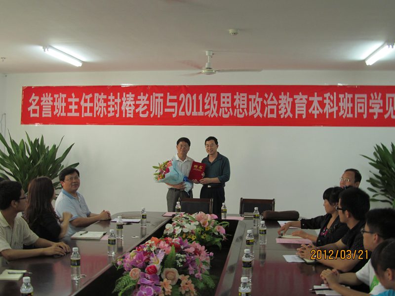 2012年3月21日下午,我院于学院三楼会议室举行名誉班主任聘任仪式暨名誉班主任与2011级思想政治教育专业本科班全体同学见面会。校党委副书记、纪委书记陈封椿老师,院长李德芳老师,书记梁谋老师,系主任王善老师,学工办主任周郭军老师,班主任陈思莲老师及2011级本科思政班全体同学参加了见面会,大会由院党委书记梁谋老师主持。