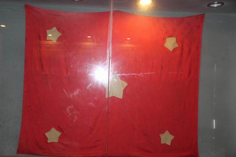 在白公馆监狱,我看到一面用红色绣花被面做成的五星红旗。缀在中间的一颗大星和环绕四周的四颗小星,都是用草纸做成的,这是狱中难友为迎接重庆解放而精心制作的一面国旗。当他们听到中华人民共和国成立,第一面五星红旗飘扬在天安门广场上的喜讯后,仅凭自己的想像,做成了这面红旗。他们在制作这面特殊的红旗时,一定畅想明天,憧憬未来,一定为梦寐以求、为之奋斗的事业终于成为现实而欣喜万分。然而,共和国成立的时刻,他们却仍然被关在暗无天日的牢房里,他们无法走上街头汇入到欢乐的人海中,无法亲眼看见第一面五星红旗的冉冉升起,他们只能在心中默默欢呼,用眼神暗暗祝贺。