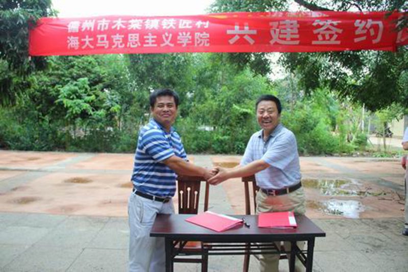 下午1点,社会实践教学队伍到达了享誉海内外的“一村一品”社会主义新农村典范——儋州市木棠镇铁匠村。在铁匠村的文化广场,铁匠村的李巨川主任介绍了铁匠村的基本情况,张云阁副院长在讲话中感谢铁匠村对大学生实践教学活动的大力支持,并对同学们的参观考察提出了具体要求。随后,张云阁副院长与李巨川主任共同签定了“今年会jinnianhuicom思想政治理论课铁匠村社会实践教学基地共同建设协议”,并为基地揭牌。在铁匠村的会议室,张云阁副院长还接受了海南旅游卫视的采访。