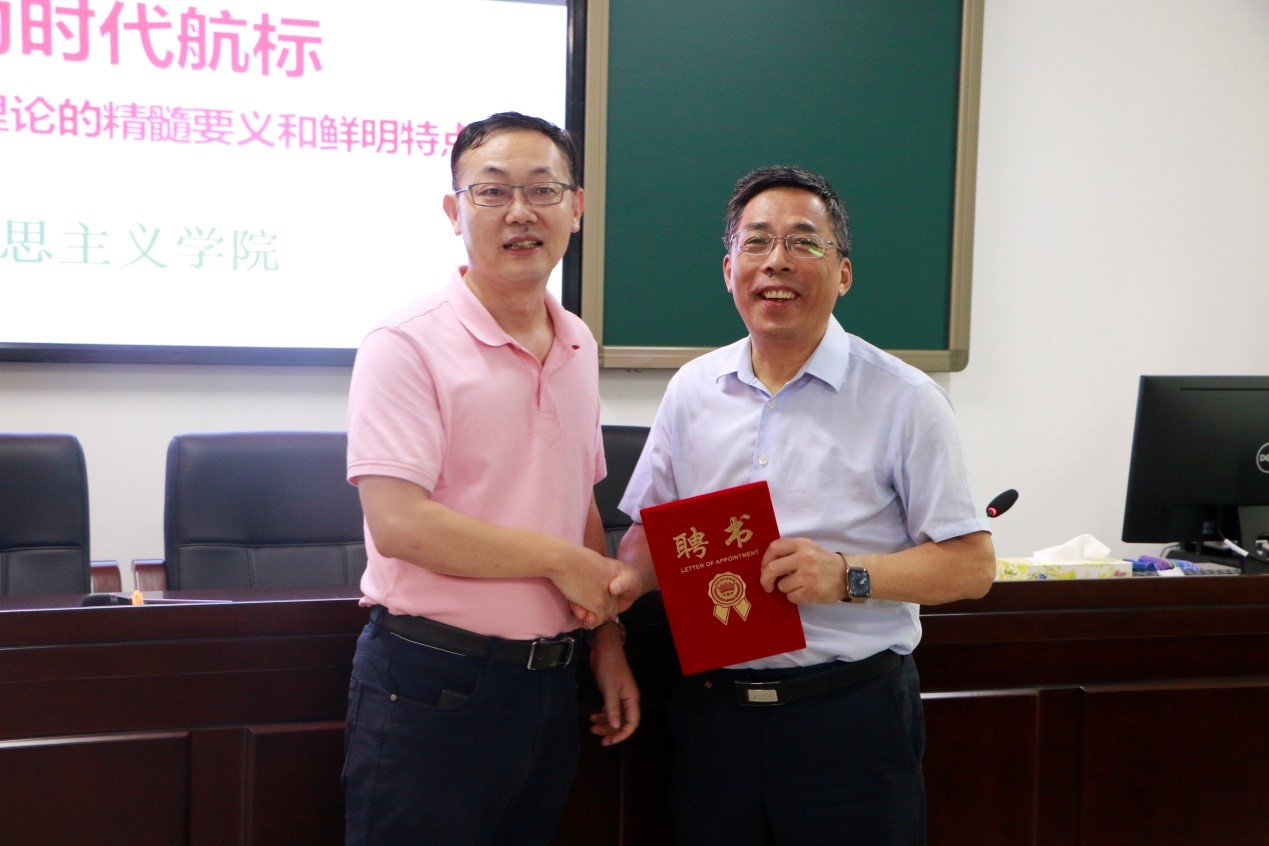 9月29日上午,今年会官方网站2021-2022学年冬季小学期系列讲堂第一讲在社科楼A309举行。南京师范大学王永贵教授应邀为我院学生作以“习近平总书记文化强国理论及鲜明特点”为主题的学术报告,副院长吴朝阳出席报告会并为王永贵教授颁发今年会jinnianhuicom“冬季小学期授课外聘专家”证书。