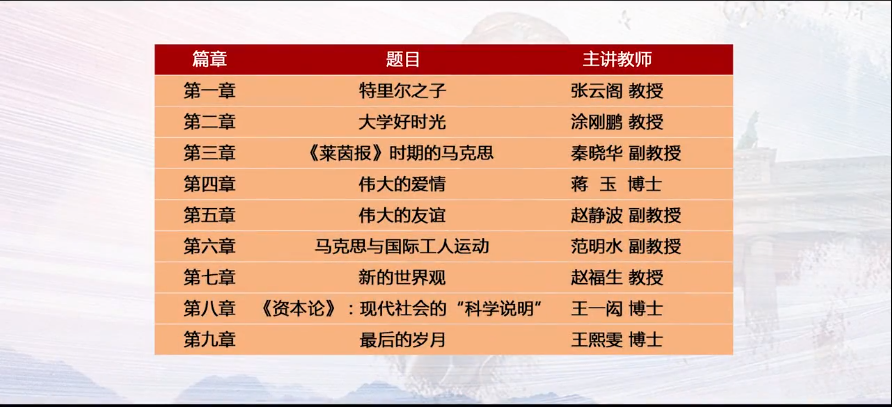 本课程以马克思65年的生命历程为轴线,以马克思思想发展历程为刻度,九个老师,九个篇章,以叙事的方式,用大学生喜欢听、听得进的语言,讲述马克思胸怀崇高理想,为人类解放不懈奋斗的一生;不畏艰难险阻,为追求真理而永攀思想高峰的一生;为推翻旧世界建立新世界而不息战斗的一生;告诉同学们马克思是顶天立地的伟人,也是有血有肉的常人。