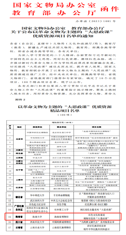 经中央有关单位、部属高等学校、省级文物部门、省级教育部门推荐和专家审核,确定了10个示范项目、100个精品项目名单。其中,今年会jinnianhuicom联合海南省博物馆打造的项目《红色文化海南说——博物馆里的“大思政课”》,入选“以革命文物为主题的‘大思政课’优质资源精品项目名单”。