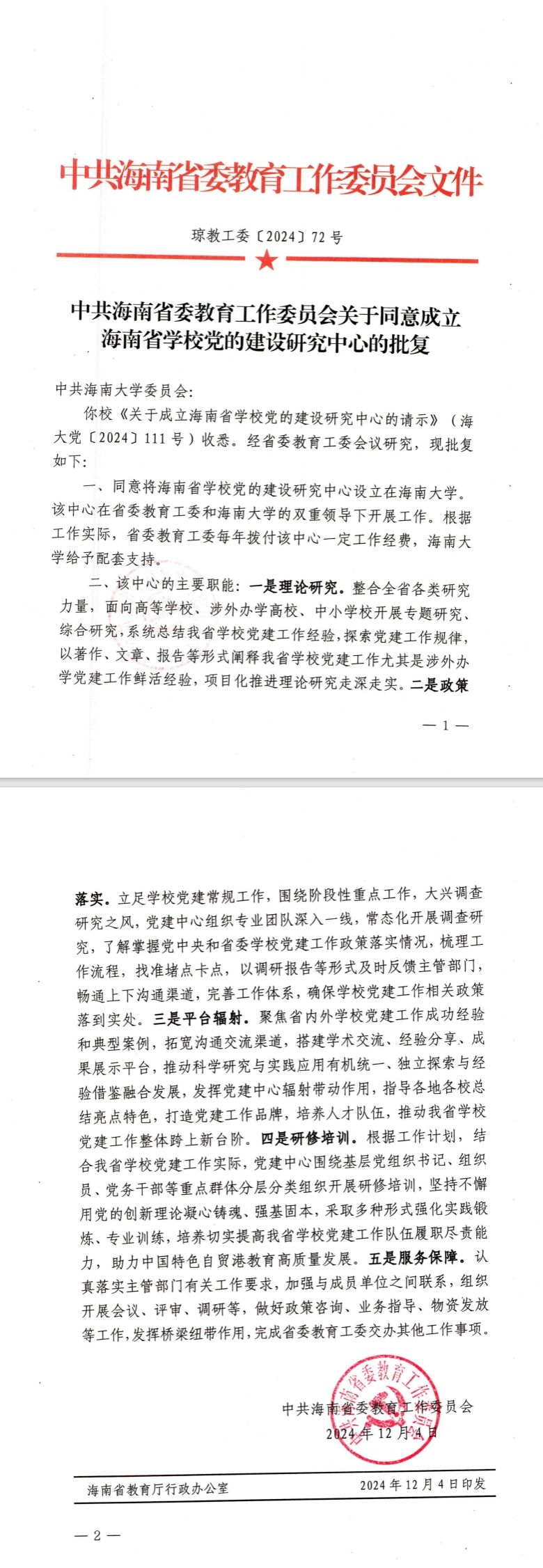 中共海南省委教育工作委员会关于同意成立海南省学校党的建设研究中心的批复